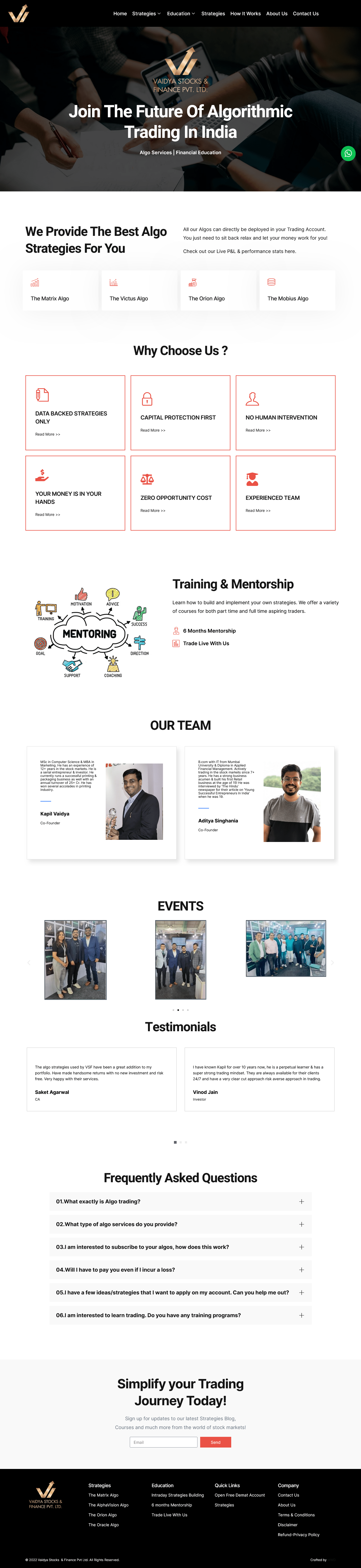 Vaidya Stocks & Finance Pvt. Ltd. required a finance website design that effectively communicates their quantitative trading strategies and financial education services. As a web development company in Mumbai, MWD understood the importance of creating a platform that integrates seamlessly with the client’s branding and objectives. The client emphasized the following requirements